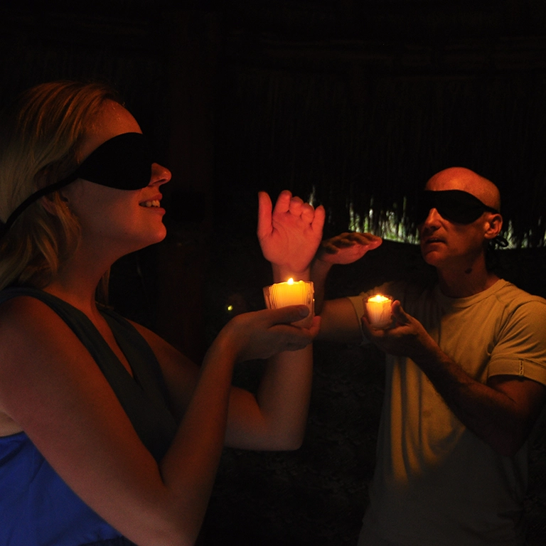 It’s important to note that the Sense Adventure experience is constantly evolving, always being renewed. Participants experience a unique sensorial experience, exploring blindfolded and connecting with their surroundings through touch, smell, taste, and hearing: the sound of seeds, the freshness of water, the warmth of fire, the scent of flowers, the hardness of rocks… the heartbeat of the group and immersion in the natural world.